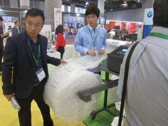 新達今次展出的主打產(chǎn)品之一是充氣的緩沖包裝袋,主要用于物流、快遞包裝。