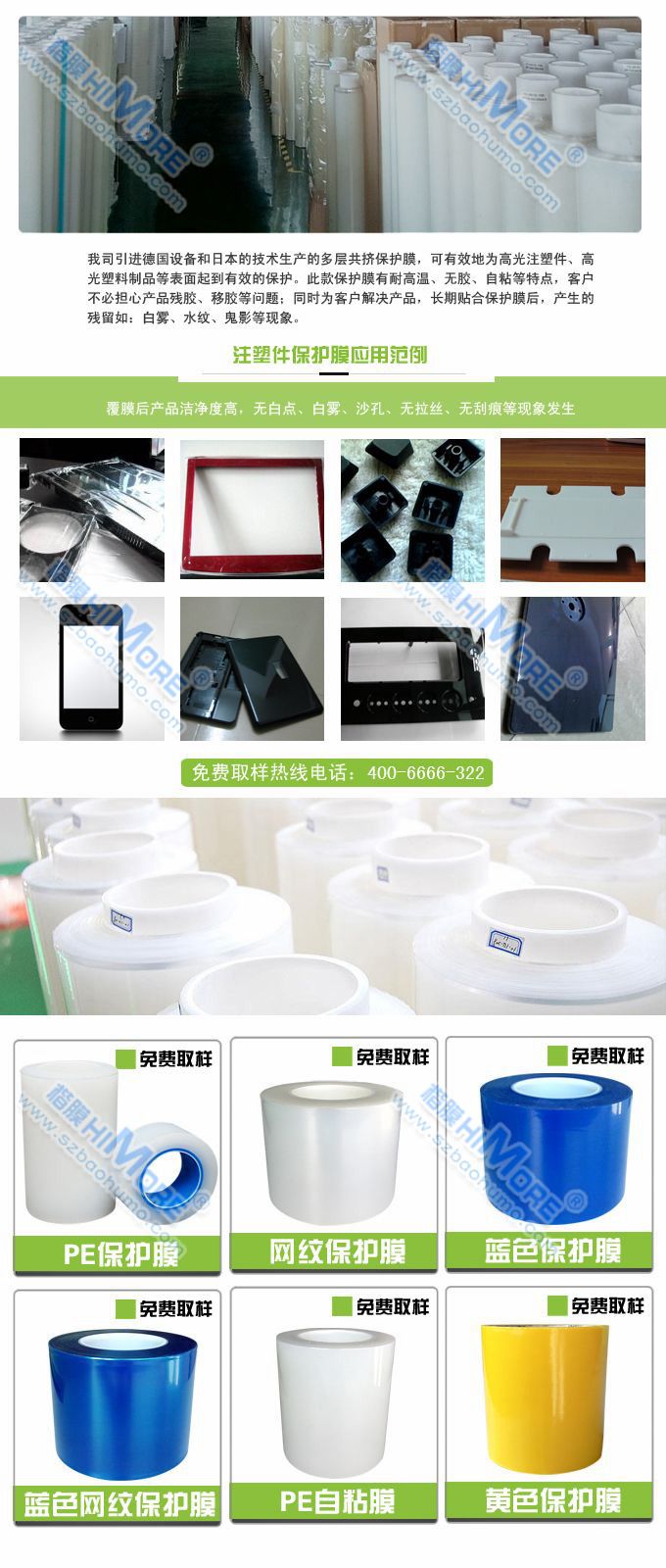 我司引進(jìn)德國設(shè)備和日本的技術(shù)生產(chǎn)的多層共擠保護(hù)膜,可有效地為高光注塑件、高光塑料制品等表面起到有效的保護(hù)。此款保護(hù)膜有耐高溫、無膠、自粘等特點(diǎn),客戶不必?fù)?dān)心產(chǎn)品殘膠、移膠等問題;同時為客戶解決產(chǎn)品,長期貼合保護(hù)膜后,產(chǎn)生的殘留如:白霧、水紋、鬼影等現(xiàn)象。